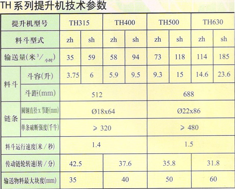 本提升機為混合或重力方式卸料,掏取式裝料,適用輸送堆積密度不大于1.5t/m3 的物料的粉狀、粒狀、小塊狀的低磨琢性物料,物料的溫度不得超過250度。